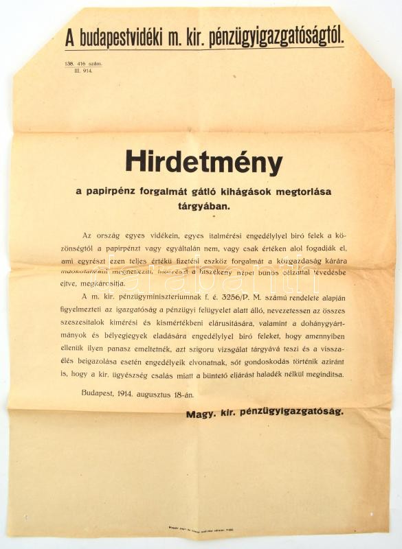 Beschreibung: 1914 A papírpénz forgalmát gátló kihágások megtiltása tárgyában hirdetmény. Szakadással 32x44 cm