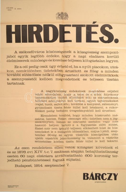 1914 Budapest fővárosi rendelet a piaci élelmiszerekkel kapcsolatos hi... https://www.darabanth.com/de/367-Fernauktion/367.0/Kunst-Dokumente-andere-Sammelgebiete/Drucksachen~31/1914-Budapest-fovarosi-rendelet-a-piaci-elelmiszerekkel-kapcsolatos-higieniai-intezkedesekrol~II2128811