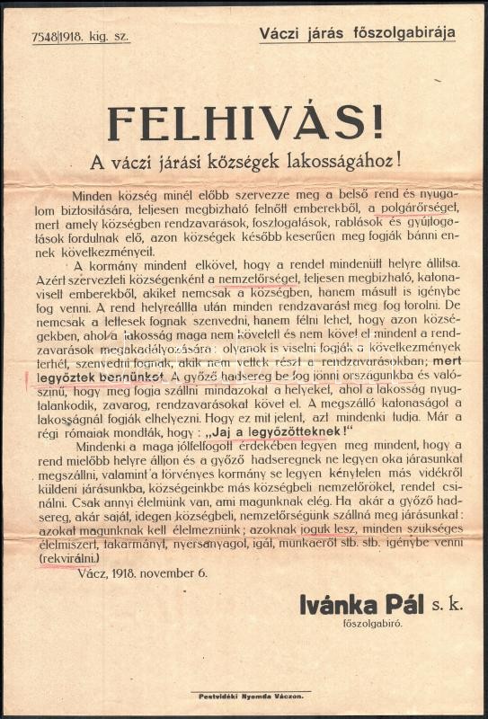 1918 Nemzetőrség és polgárőrség szervezésére szóló felhívás Vác térség... https://www.darabanth.com/de/367-Fernauktion/367.0/Kunst-Dokumente-andere-Sammelgebiete/Drucksachen~31/1918-Nemzetorseg-es-polgarorseg-szervezesere-szolo-felhivas-Vac-tersegeben~II2129638