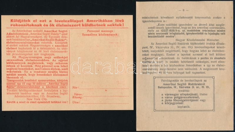 Beschreibung: 1920 Amerikai élelmiszersegély levelezőlap és ismertető