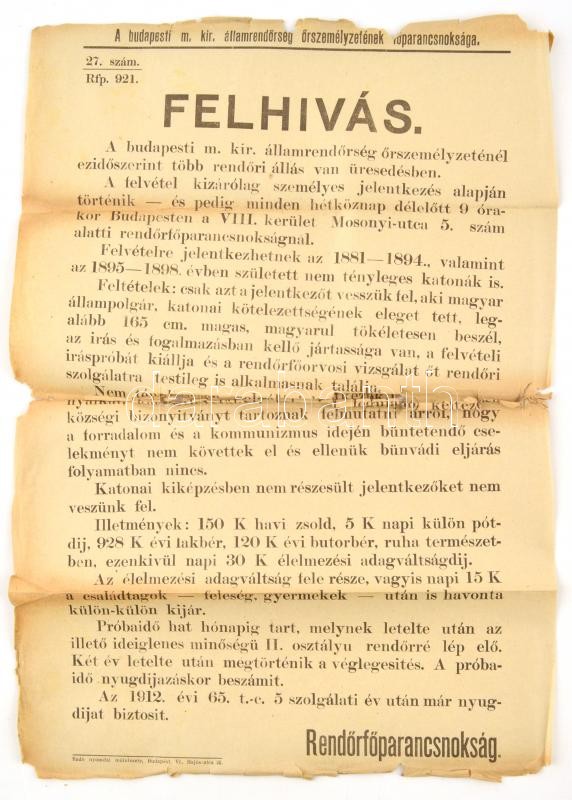 Beschreibung: 1921 Rendőr őrszemélyzet toborzó plakátja 30x43 cm szakadozott széllel