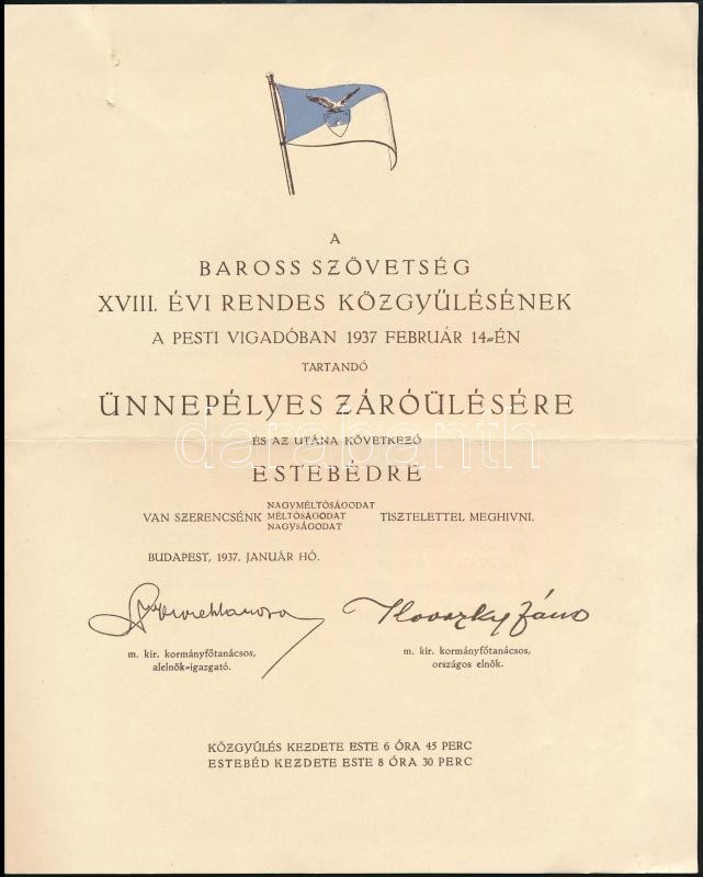 1937 Meghívó a Baross Szövetség közgyűlésére, nyomtatott aláírásokkal https://www.darabanth.com/de/367-Fernauktion/367.0/Kunst-Dokumente-andere-Sammelgebiete/Drucksachen~31/1937-Meghivo-a-Baross-Szovetseg-kozgyulesere-nyomtatott-alairasokkal~II2129957