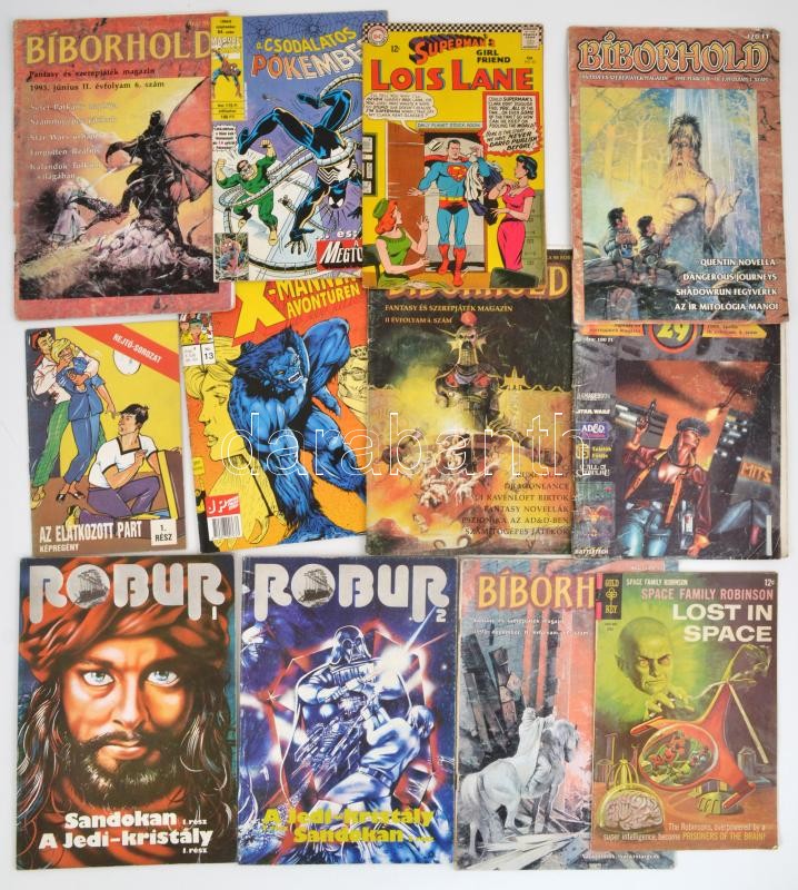 cca 1965-1995 Science fiction, fantasy, szuperhős képregény és szerepjáték magazin tétel, össz. 11 db: 1 db Space Family Robinson. Lost in Space. No. 27, April, 1968, amerikai képregény, angol nyelven. Enyhén kopott borítóval, utolsó lapon kis szakadással + Superman's girl friend Lois Lane. No. 63, Feb., 1965, amerikai képregény, angol nyelven. National Comics, DC. Borító kopott és kis sérüléssel + A csodálatos pókember ... és a megtorló. 1994/9 szeptember, 64. szám. Semic Interprint. Borító enyhén kopott, máskülönben jó állapotban. + X-Mannen Avonturen Nr. 13. Ca. 1994-95. Flamand nyelven, Borító hajtásnyommal. + Rejtő Jenő képregény-sorozat: Az elátkozott Part 1 rész. + 4 db klf. Bíborhold fantasy és szerepjáték magazin: II. évf. 4. sz. (93/4), II. évf. 6. sz. (93/június), III. évf. 3. sz. (94/március), II. évf. 12. sz. (93/december), vegyes, megviselt állapotban. AD&D, M.A.G.U.S., Star Wars, Shadowrun, Forgotten Realms stb. témákban. + 1 db Holdtölte fantasy és szerepjáték magazin, 1995. április, IV. évfolyam, 4. sz. Megviselt állapotban + Robur magazin 1. és 2. száma, többek közt a Jedi-Kristály 1- és 2. rész, jó állapotban.