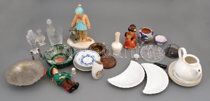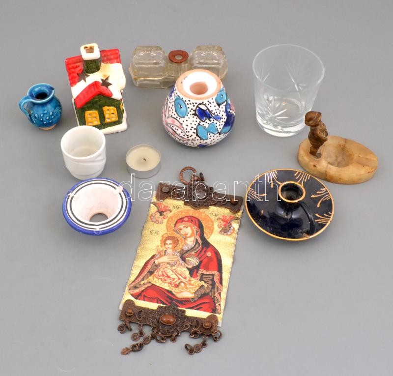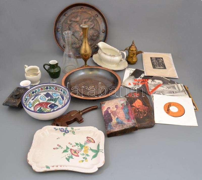 Beschreibung: Banános ládányi vegyes bolha tétel: fali tál, kis kancsó, gyertyatartó, hamutál, stb.