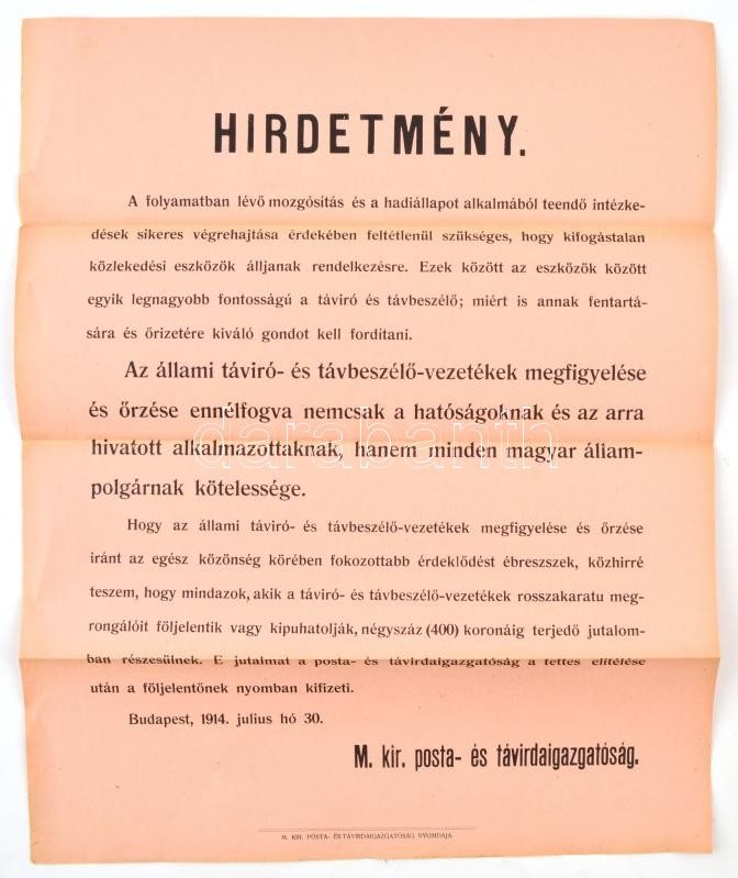 1914 július 30. Felhívás távíró és távbeszélő eszközök védelmére a moz... https://www.darabanth.com/de/367-Fernauktion/367.0/Kunst-Dokumente-andere-Sammelgebiete/Militaria~29/1914-julius-30-Felhivas-taviro-es-tavbeszelo-eszkozok-vedelmere-a-mozgositas-miatt~II2130101