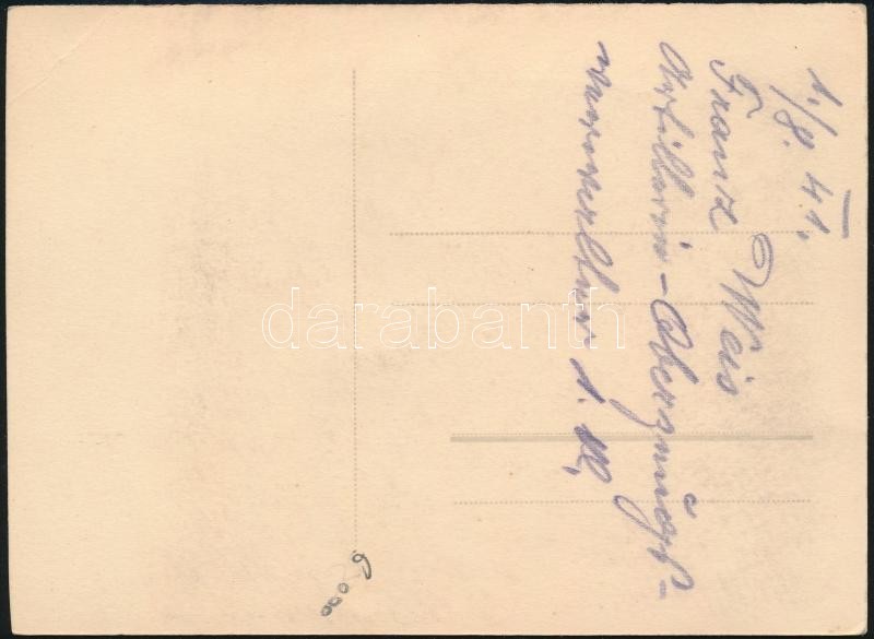 Beschreibung: 1941 Franz Weis, osztrák tüzér ezredes fotója, kitüntetésekkel, fotólap, a hátoldalán ceruzás jegyzettel, 12x9 cm