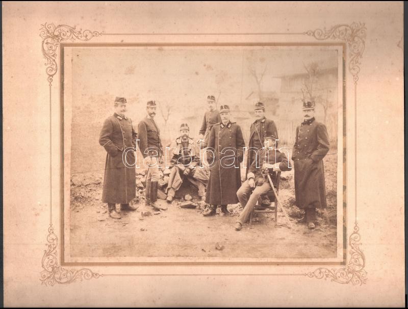 cca 1900 Éder Pál (1849-1916) a soproni cs. és kir. báró Salis-Soglio Gyalogezred tisztje (századosa ?) és katonatársai, fotó kartonon, a felületén kis foltokkal, 20x25 cm