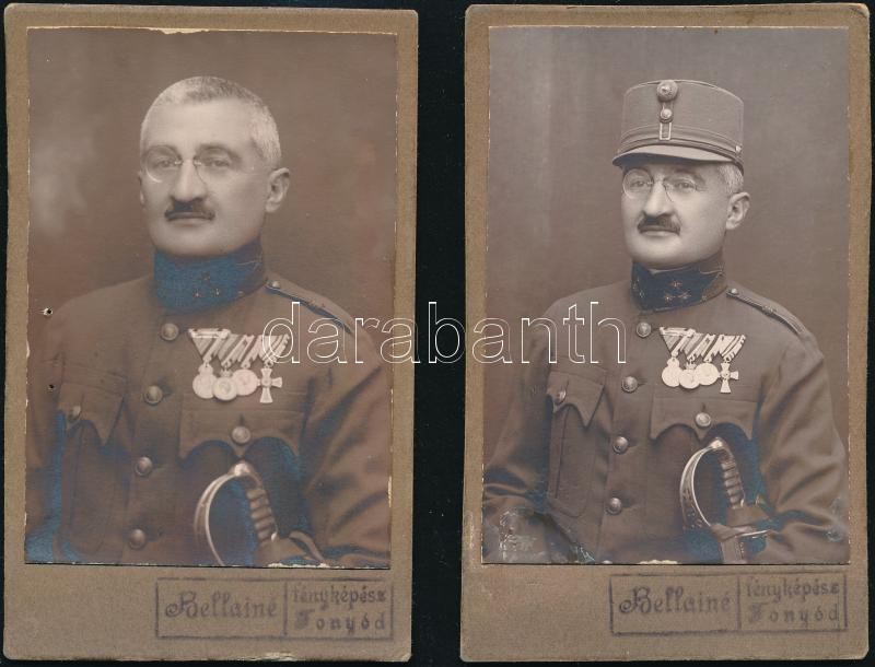 cca 1910 Fonyód, egyházpakai és csukárdi Andrássy Dezső (?-1943) százados portréfotója, kitüntetésekkel, karddal, 2 db keményhátú fotó, Fonyód, Bellainé műterméből, az egyik felületén kis kopásnyomokkal, 10x6 cm