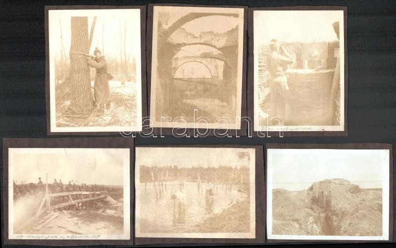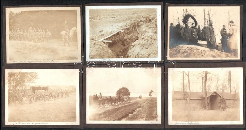 cca 1914-1918 össz. 15 db I. világháborús fotó a keleti frontról, több feliratozott ("lakásom bejárata", "23-as megfigyelőállás", "német dragonyosok az offenzíva előtt", "orosz állások", 26-ok az offenzívára" stb.), egyik katonai temetésről, másikon fürdőző katonák. Albumlapra ragasztva és abból kivágva. Vegyes, nagyrészt jó állapotban (1 db foltos, 1 db szakadással) 9x12 cm