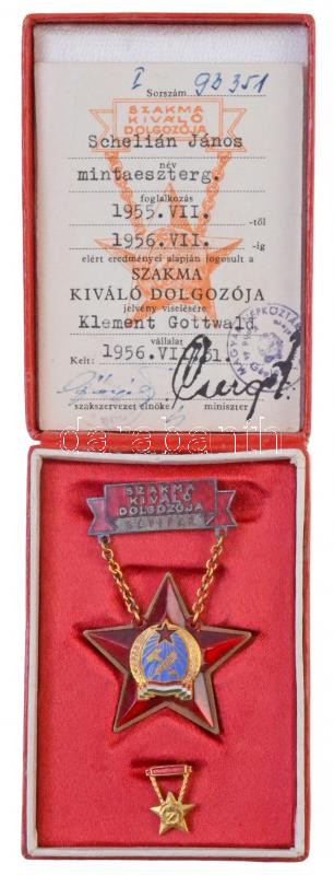 Beschreibung: ~1950. "Szakma Kiváló Dolgozója - Gépipar" zománcozott kitüntetés, hátlapon gravírozott "93351" sorszámmal, eredeti dísztokban, viselői igazolvánnyal mintaesztergályos számára T:2