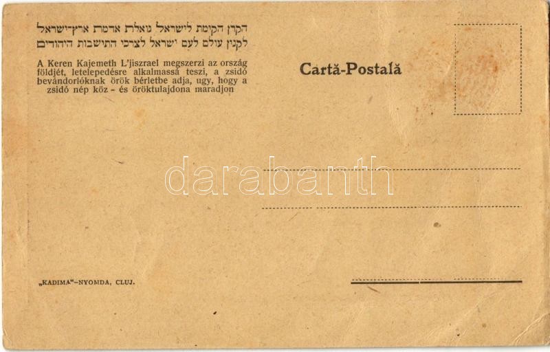 Noul cartier al orasului Jaffa "Nordita" / Jaffa új városnegyede "Nordia". A Keren Kajemeth le Jiszrael megszerzi az ország földjét, letelepedésre alkalmassá teszi, a zsidó bevándorlóknak örök bérletbe adja, úgy, hogy a zsidó nép köz- és öröktulajdona maradjon. "Kadima" nyomda (Kolozsvár) / New quarter in Jaffa, Jerusalem called "Nordia", funded by the Jewish National Fund (Keren Kayemet LeYisrael). Hebrew text on the backside. Judaica (EK)