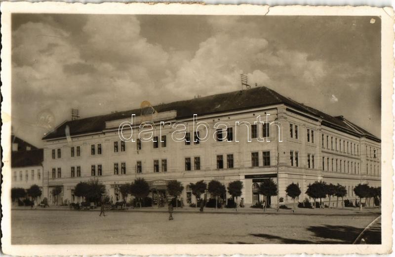 Beschreibung: 1942 Sepsiszentgyörgy, Sfantu Gheorghe; Székely Mikó kollégium, Klein, Dézsi, Féder, Barabás üzlete / Calvinist boarding school, college, shops (kis szakadás / small tear)