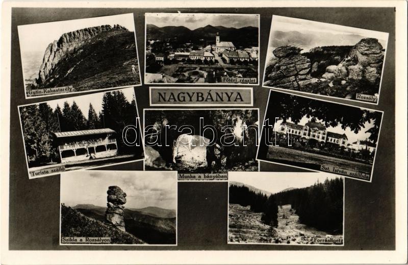 1943 Nagybánya, Baia Mare; Gutin, Fő tér, Rozsály, Turista szálló, Munka a bányában, Szent István szálloda, szikla a Rozsályon, Forrásliget / main square, tourist hotel, work in the mine, hotel, mountains