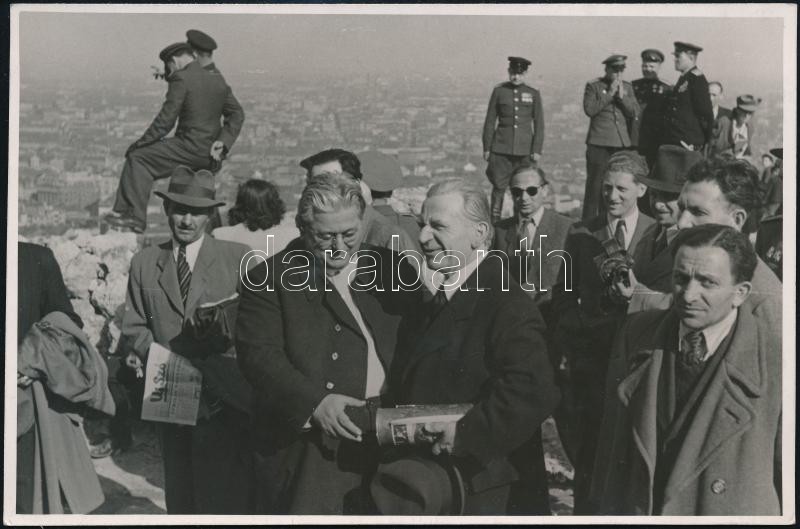 cca 1945 Balogh István(1894-1976)katolikus pap, kisgazdapárti politikus, államtitkár fotója, a háttérben Budapesttel, fotó, Magyar Központi Híradó Rt. Schenk Fotó, a hátoldalán pecséttel, 11x17 cm