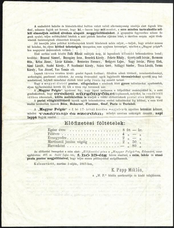 1867 Előfizetési felhívás a Magyar Polgárra. https://www.darabanth.com/de/368-Fernauktion/368.0/Kunst-Dokumente-andere-Sammelgebiete/Drucksachen~1000032/1867-Elofizetesi-felhivas-a-Magyar-Polgarra~II2132841