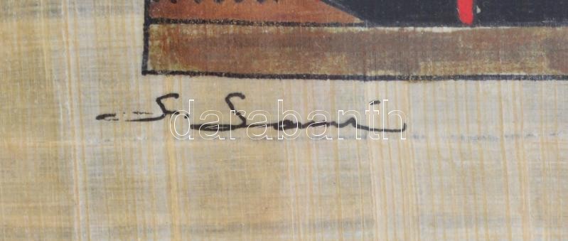Beschreibung: Modern egyiptomi szuvenír papiruszkép, kézzel festett, olvashatatlan jelzéssel, 18×23 cm