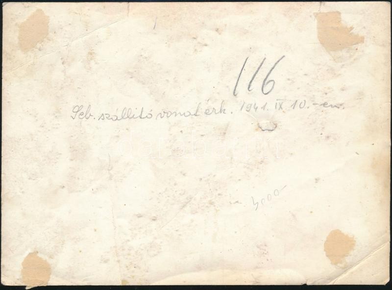 Beschreibung: 1941 Sebesült szállító vonat érkezik, a vonaton Werth Henrik tábornokkal, fotó, a felületén törésnyomokkal, 13x18 cm
