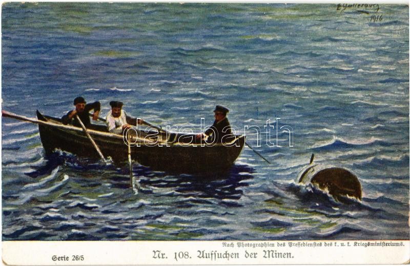 Beschreibung: Aufsuchen der Minen. K.u.K. Kriegsmarine / Austro-Hungarian Navy art postcard, mine hunting. Zum Gloria-Viktoria-Album Serie 26/5. Nr. 108. s: Galterburg