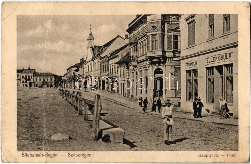 Beschreibung: 1918 Szászrégen, Reghin; Hauptplatz / Fő tér, Fränkel A., Ellek Gyula üzlete / main square, shops (fa)
