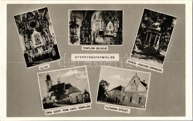 Gyergyószentmiklós, Gheorgheni; Örmény szertartású római katolikus templom, belső, oltár, plébánia épület, Görög Joachim síremlék / Armenian catholic church, interior, altar, parish, cenotaph