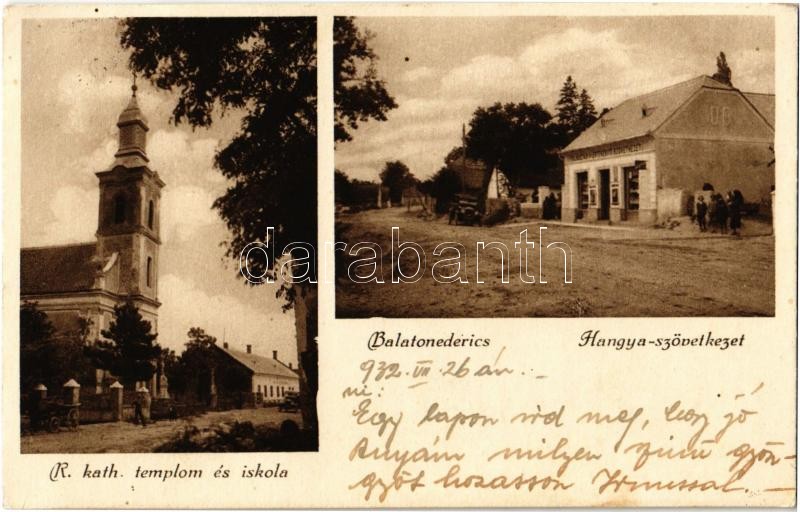 Beschreibung: 1932 Balatonederics, Római katolikus templom és iskola, Hangya szövetkezet üzlete és saját kiadása