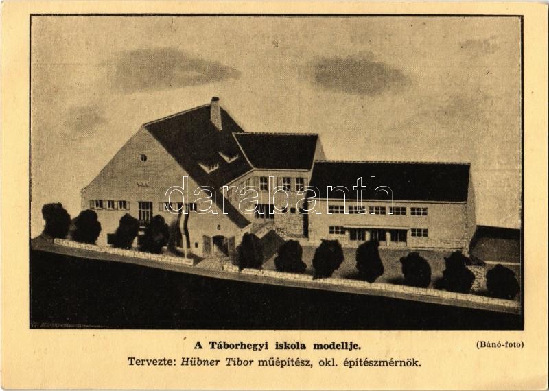 1943 Budapest III. Táborhegyi iskola modellje. Tervezte Hübner Tipor műépítész, okleveles építészmérnök. Bánó foto. Hátoldalon az Újlaki Hegyvidéki Egyesület tábor, testvér és csúcshegyi csoportja meghívása Bokréta ünnepélyre (EK)