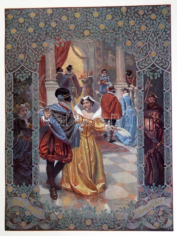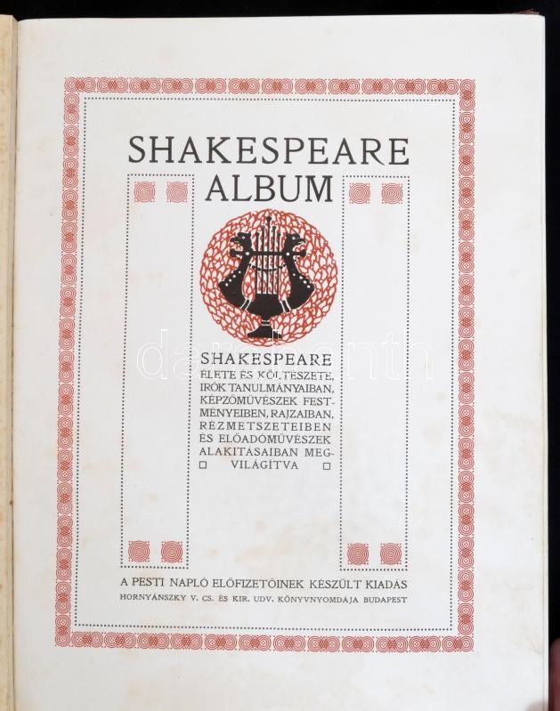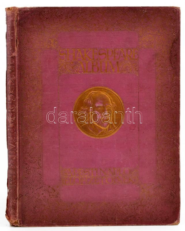Shakespeare album. Shakespeare élete és költészete, írók tanulmányaiban, képzőművészek festményeiben, rajzaiban, rézmetszeteiben és előadóművészek alakításaiban megvilágítva. A Pesti Napló előfizetőinek készült kiadás. Bp., é.n., Hornyánszky. 132 p.+12 t. (színes, feliratozott hártyapapírral.) Egész oldalas és szövegközti képekkel gazdagon illusztrálva. Kiadói illusztrált aranyozott egészvászon-kötésben, kopott borítóval, sérült gerinccel, foltos lapokkal, hiányzó címképpel.