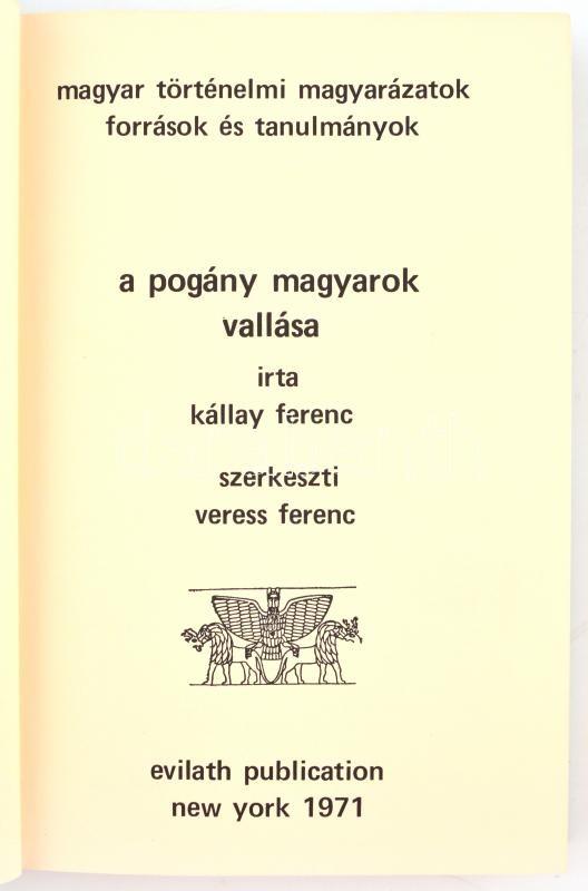Kállay Ferenc: A pogány magyarok vallása. Reprint kiadás. New York, 1971. Evilath publication, Magyar Történelmi Magyarázatok források tanulmányok sorozat . Szerk: Veress Ferenc. Kiadói műbőr kötésben