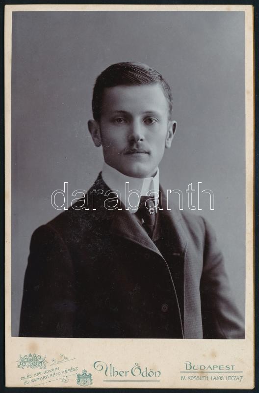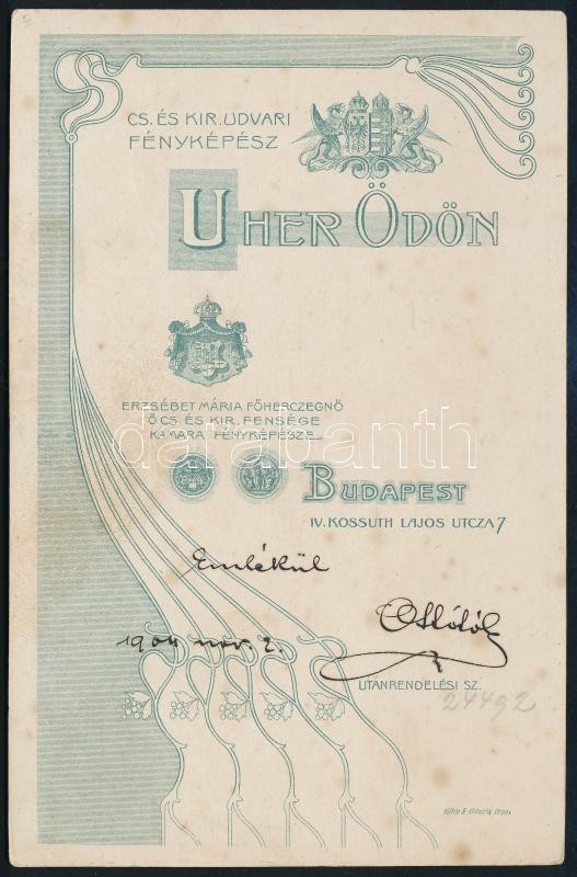 1904 Budapest, Uher Ödön (1862-1931) császári és királyi udvari fényképész műtermében készült vintage fotó, kabinetfotó méretben, feliratozva, datálva, ez a szerző 24492. sz. felvétele, 16,5x10,6 cm