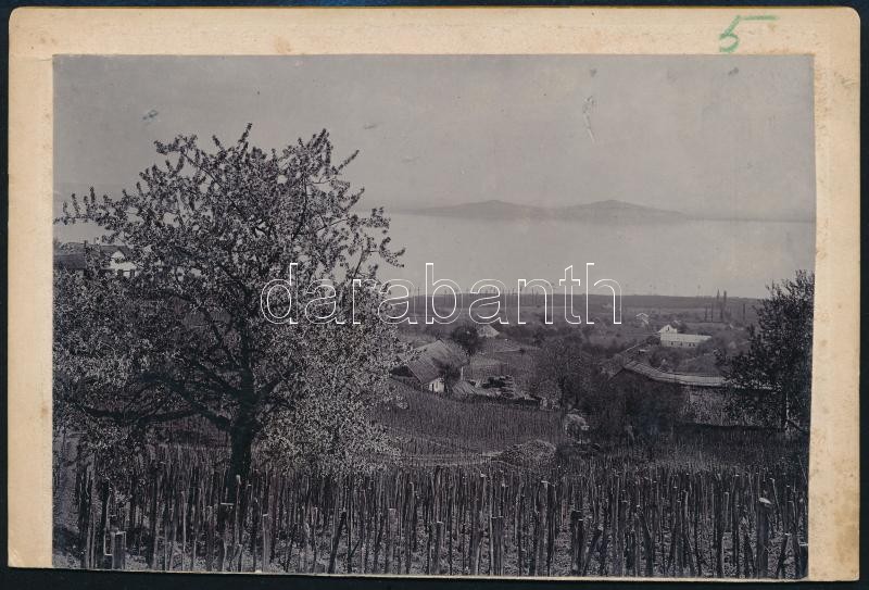 Beschreibung: 1907 Kilátás Badacsonyból, háttérben Fonyód, hátoldalon feliratozott keményhátú fotó, vágott karton, 11,5×18 cm