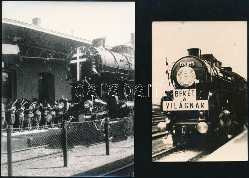 Régi mozdonyok: az Aranyvonat beérkezése a székesfehérvári állomásra (későbbi előhívás) + "Békét a világnak" feliratú 424-es mozdony korabeli fotója, 9,5×6,5 és 12×9 cm
