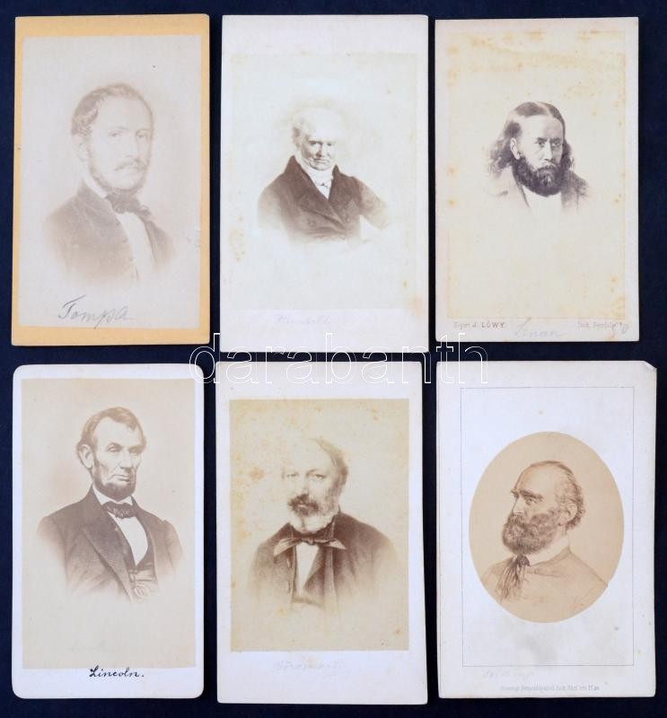 cca 1860-70 6 db portré a kor híres embereiről, keményhátú fotók: Vörösmarty Mihály, Abraham Lincoln, Alexander v. Humboldt, Tompa Mihály, Széchényi (Simonyi Fényirdájából, Pest) és Nikolaus Lenau (J. Löwy, Wien) ca. 10x6,5 cm