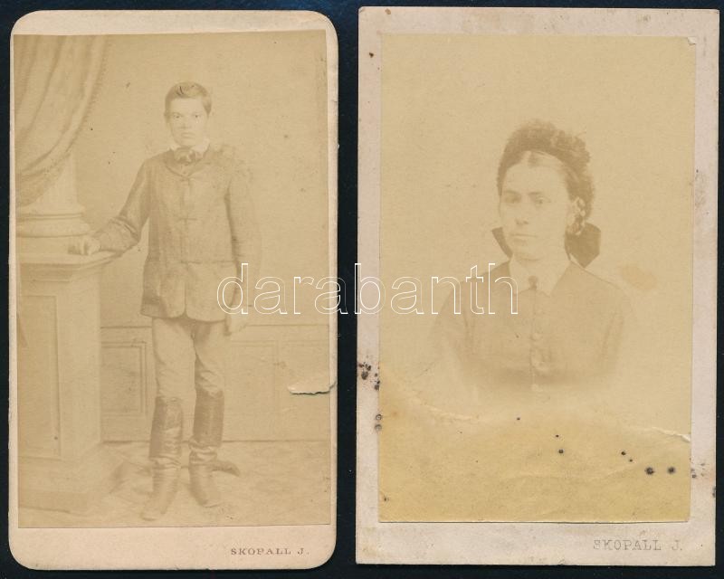 Beschreibung: cca 1860 Győr, Skopall József (?-?) fényképész műtermében készült, vizitkártya méretű, 2 db vintage fotó, mindkettő sérült, 10,2x6,6 cm