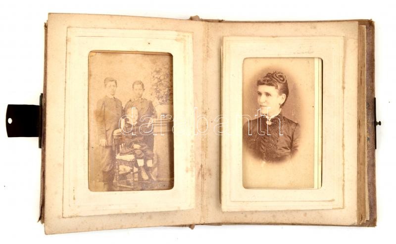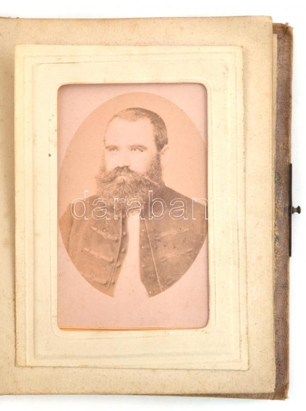 cca 1870-1889 Fotóalbum, 11 db keményhátú fotóval, portré fotók, keményhátú fotók, fotók kartonon, HódmezÅ‘vásárhely, Plohn Illés (7 db); Szarvas, Rottmann Farkas (1 db); Pest-Gyöngyös-Jászberény, Licskó J. (2db), 1 db azonosÃtatlan műtermi fotó, kopott, sérült vászonkötésű fotóalbumban, 10x6 cm