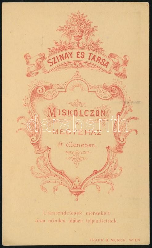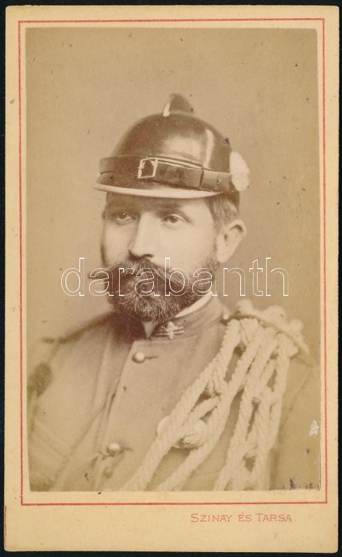cca 1874 Miskolci Önkéntes Tűzoltó és Mentőegyesület egyik alapító tagjának keményhátú fotója, tűzoltó jelvénnyel a gallérján, Miskolc, Szinay és Társa, 10x6 cm