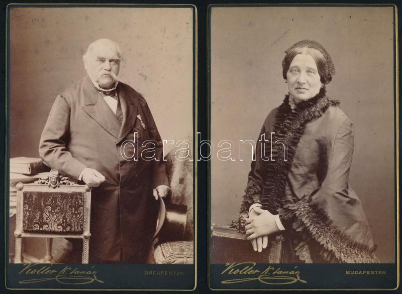 cca 1880 Budapest, Koller Károly (1838-1889) tanár, császári és királyi udvari fényképész budapesti műtermében készült 2 db vintage fotó egy házaspárról, kabinetfotó méretben, ez a szerző 21088. sz. felvétele, 16,9x11 cm