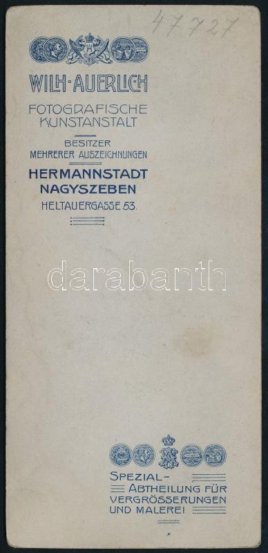 Beschreibung: cca 1900 Nagyszeben, Wilh. Aurlich fényképész műtermében készült, vintage fotó, ez a 47727. sz. felvétele, 16,3x7,5 cm