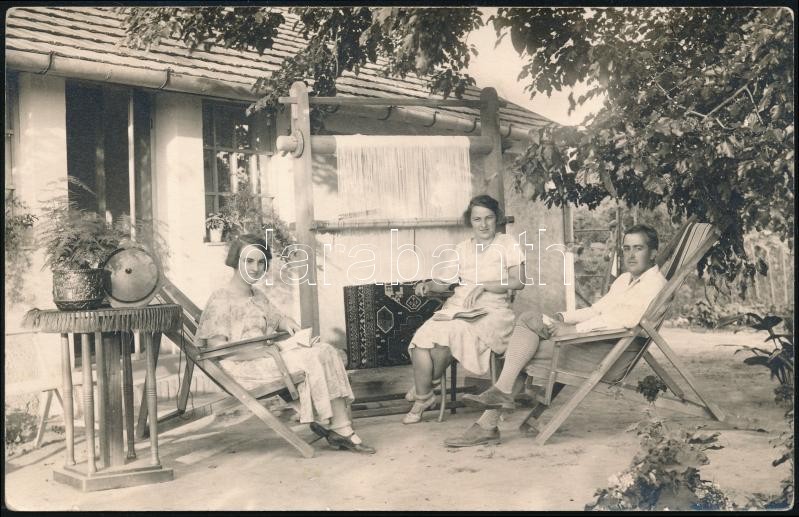 cca 1925 Szőnyegszövő hölgy az udvaron társaságban pihenés közben, pec... https://www.darabanth.com/de/369-Fernauktion/369.0/Fotografie/Foto~500019/cca-1925-Szonyegszovo-holgy-az-udvaron-tarsasagban-pihenes-kozben-pecsettel-Szremcsanyi-~II2149206