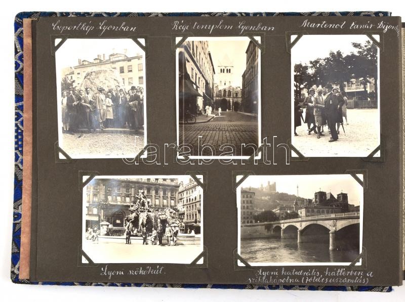 cca 1930 Fotóalbum különféle képekkel, utazásokról, Heidelberg, Lyon, Vezseny, összesen 137 db, különböző méretű fotókkal, 8,4x6 cm-től 6,5x9 cm-ig, két oldal hiányzik, album mérete: 20x30 cm