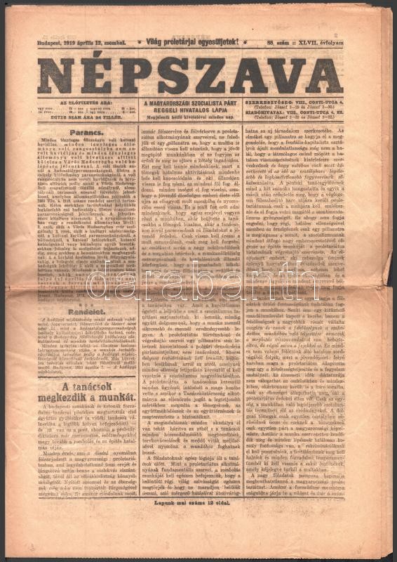 1919 Népszava. 1919. április 12., XLVII. évf. 88. sz. Benne a kor híreivel,a Vörös Hadseregbe való kötelező belépéssel a volt katonák, tisztek részére, 12 p.