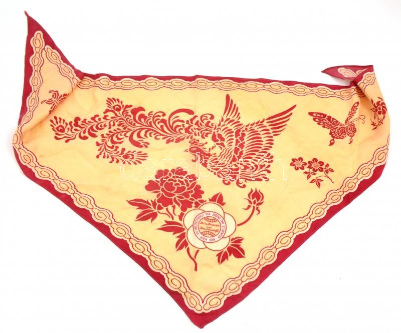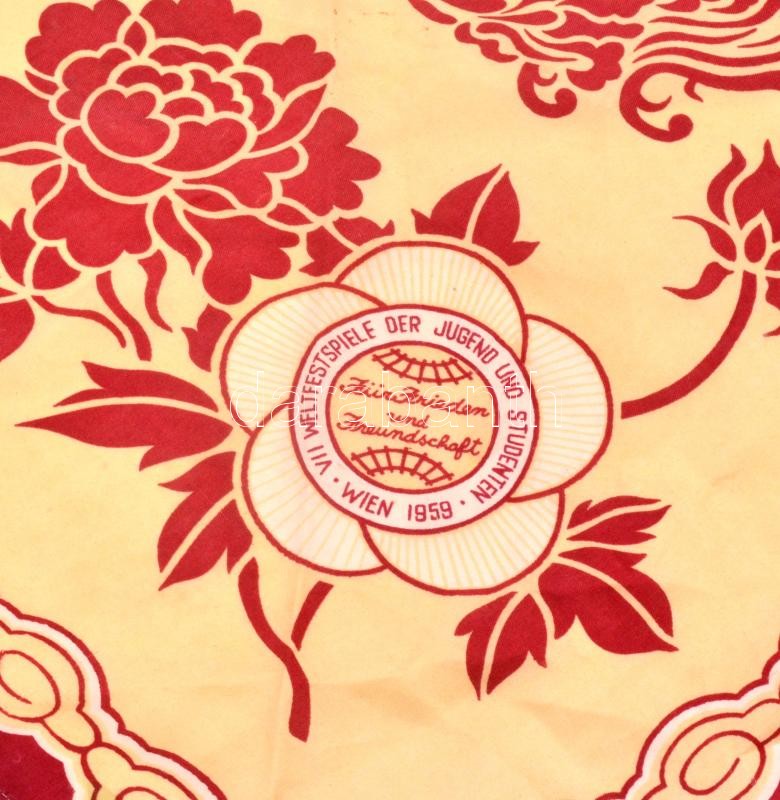 Beschreibung: 1959 VII. Weltfestspiele der Jugend und Studenten, VII. Világijfúsági és diáktalálkozó kendő, 47x103 cm.