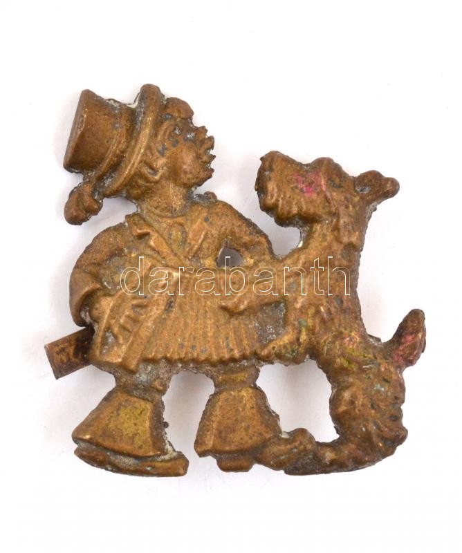 Beschreibung: Sapkajelvény, figurális harmonikázó fiú és kutya motívummal díszített, 3,5x3 cm