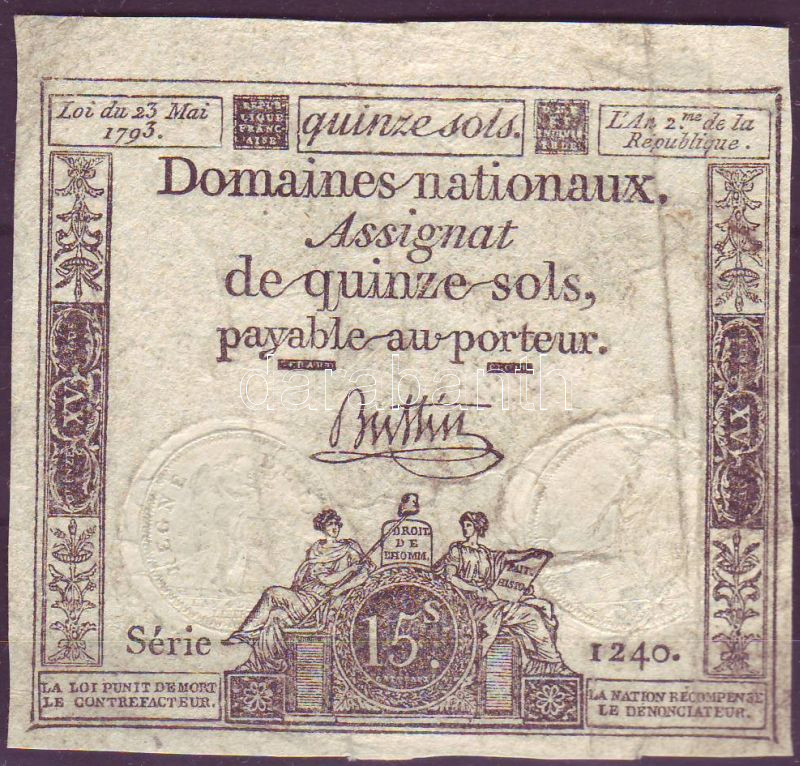 Franciaország 1793. "Assignat" 15S T:II- szélesebb ívszéllel https://www.darabanth.com/de/37-Fernauktion/37.0/Numismatik/~189/Franciaorszag-1793-Assignat-15S-TII-szelesebb-ivszellel~II73045