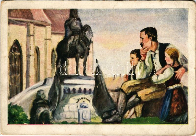 Kolozsvár, Cluj; "Lesz még kikelet Kolozsvár felett", Mátyás király szobor, népviselet. Kiadja a Magyar Nemzeti Szövetség, Don Bosco nyomda / Hungarian irredenta propaganda, Mathias Rex statue, traditional costumes, folklore s: Márton, Nógrády M. (EK)