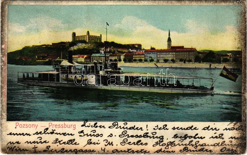 Beschreibung: 1905 Szamos monitor Pozsonynál, Dunai Flottilla. "Bediene dich allein / Donauflottille / Hungarian Danube Fleet river guard ship in Pressburg (Bratislava)