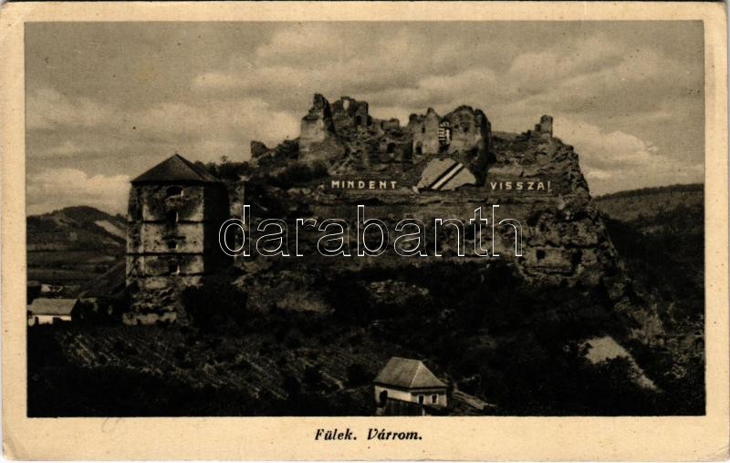 1940 Fülek, Filakovo; vár "Mindent vissza!" irredenta felirattal és magyar címerrel. Fülek visszatért. Hangya kiadása / Filakovsky hrad / castle with Hungarian coat of arms and irredenta propaganda (EK)