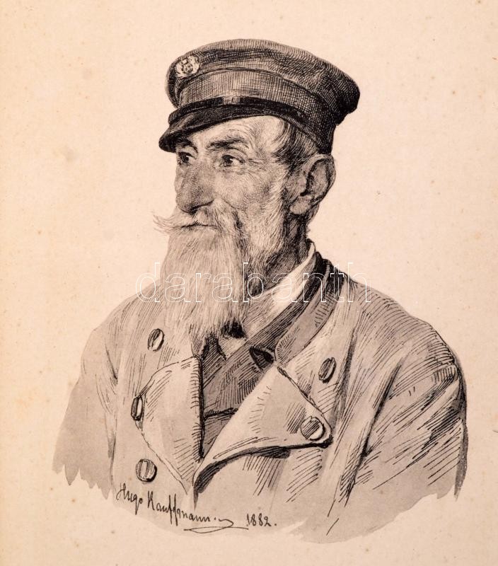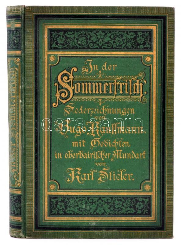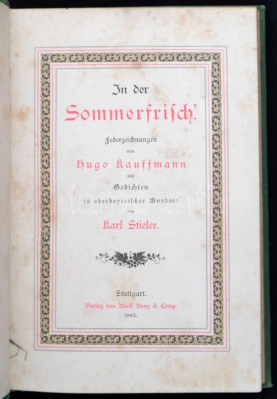 Hugo Kauffmann-Karl Stieler: In der Sommerfrisch federzeichnungen von - - mit Gedichten in oberbayerischer Mundart von - - . Stuttgart, 1883., Adolf Bonz & Comp. 19 egészoldalas képtáblával. Német nyelven. Kiadói aranyozott, festett zöld egészvászon-kötésben, aranyozott lapélekkel, foltos, kissé kopott borítóval.