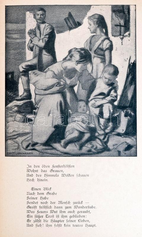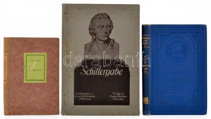 3 db német nyelvű könyv: Leo M. Tolstoi: Kurze Darlegung des Evangelium. Leipzig, é.n., Reclam. Kartonált papírkötés, tulajdonosi bejegyzéssel. Franz Grillparzer: Die Ahnfrau - Sappho. Grillparzers sämtliche Werke. Fünsfte Ausgabe in 20 Bänden. Vierter Band. Stuttgart, é.n., Cotta. Kiadói vászonkötés, aranyozott gerinccel. Schillergabe. Zeichnungen von Ernst Liebermann. München, É.n., Verlag der Jugendblätter. Kiadói vászonkötés, foltos borítóval. Friedrich Schiller költeményeivel. Gazdagon illusztrált.