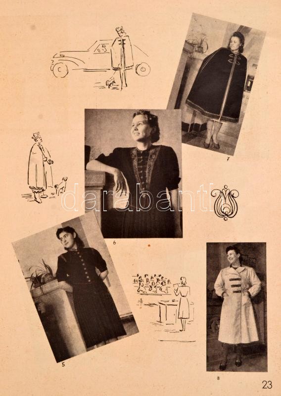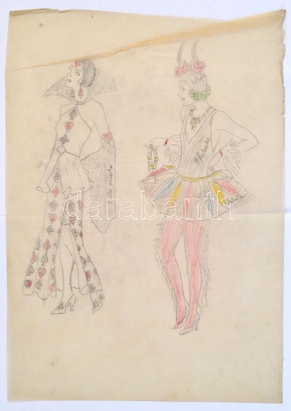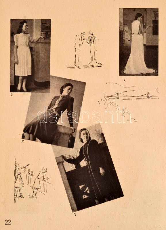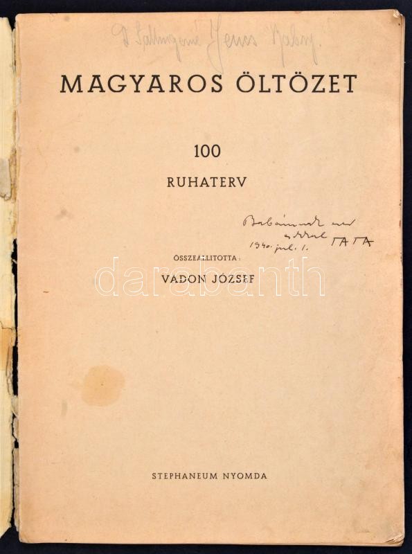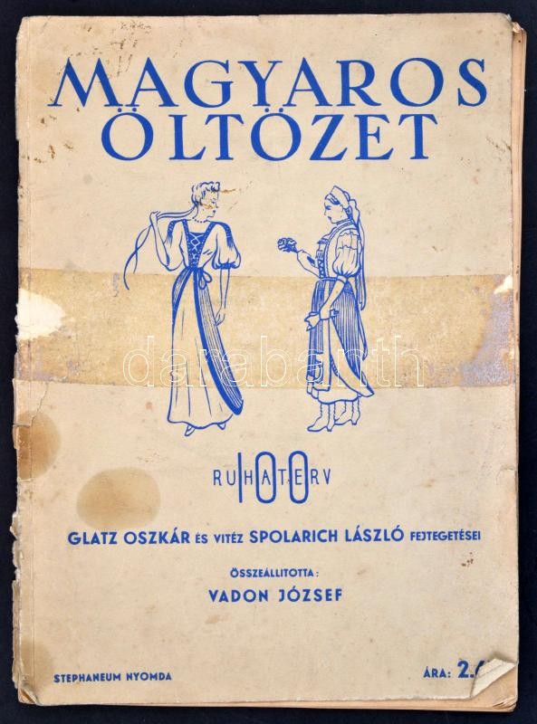 Vadon József: Magyaros öltözet. 100 ruhaterv. Glatz Oszkár és vitéz Spolarich László fejtegetései. Bp., Stephaneum Nyomda. 54 p. Glatz Oszkár (1872-1958) festőművész, főiskolai tanár 2 oldalas írásával. Kiadói papírkötés, megviselt borítóval, erősen sérült és hiányos gerinccel, néhány lap minimális és egy nagyobb szakadással. Címlapon tulajdonosi névbejegyzéssel és ajándékozási sorokkal. + Színes divatrajz, jelzés nélkül, ceruza, pauszpapír, gyűrődéssel.