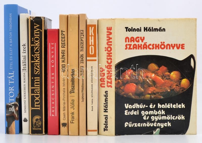 Vegyes könyvtétel, 9 db: Simeoni Szekeres Magda: Itáliai ízek, Cseh Mária-Pirchala István: 400 kínai recept, Frank Júlia: Disznótorban, Palacsinták könyve, Dr. Békési Andrea: Bátor tál, Lejtényi-Waldhauser: Régi idők receptjei, Bozsik Valéria: Különleges zöldségételek, Irodalmi szakácskönyv, Tolnai Kálmán Nagy szakácskönyv. Különféle kiadásban, és kötésben. Változó állapotban.